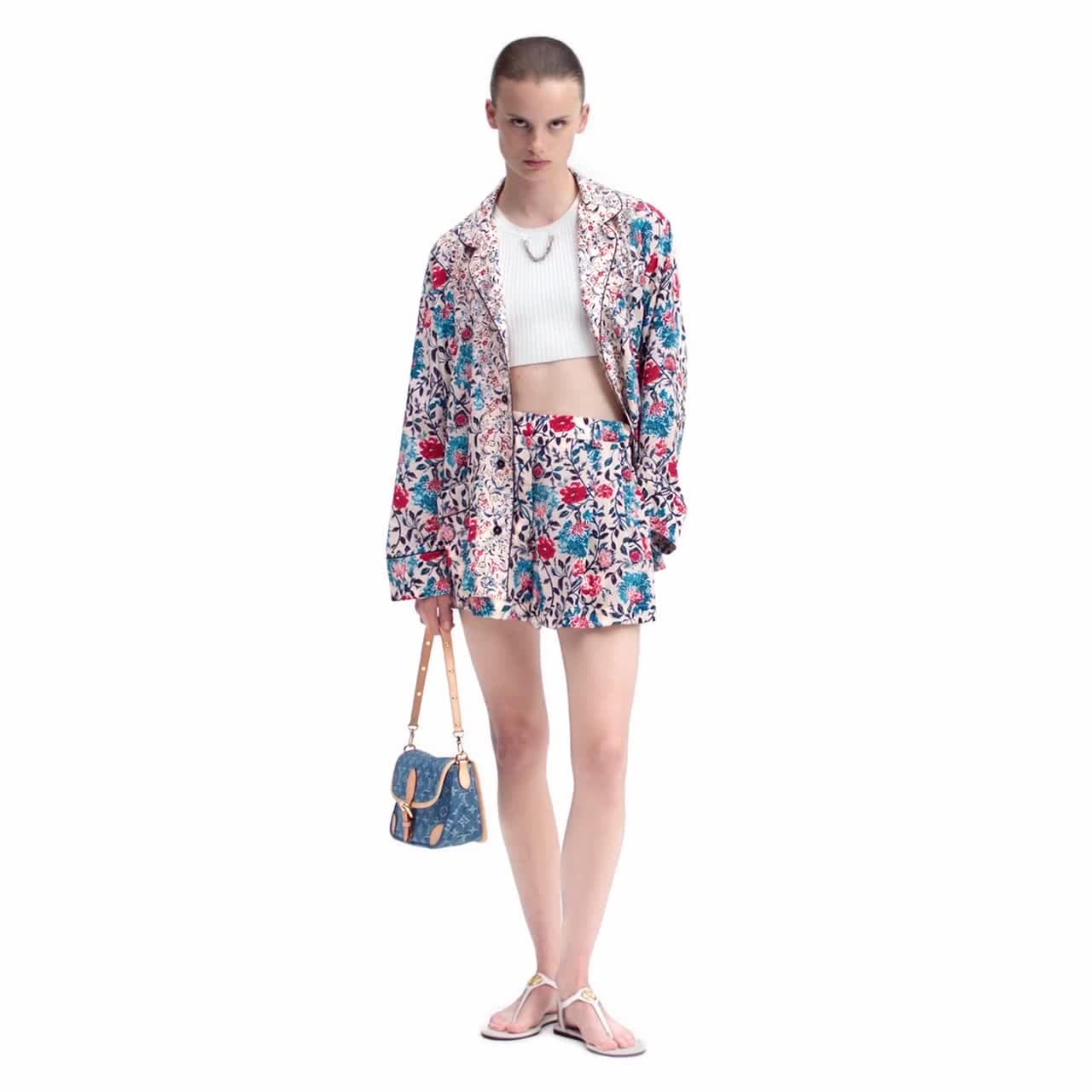 Celana pendek berpotongan longgar ini terbuat dari bahan silk crepe de chine yang ringan. Desainnya yang memikat berhiaskan motif sulur bunga khas musim panas di seluruh permukaannya. Bagian kaki terlihat lebih lebar dengan detail lipatan di bagian depan. Sementara penutup depan yang tersembunyi dan saku welt di bagian belakang menghadirkan kesan elegan sekaligus rapi.