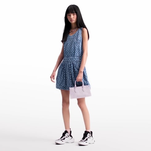 Terlihat memikat saat dikenakan sehari-hari, dress ini dibuat dari bahan denim halus dan ringan khas musim ini dengan corak Monogram di seluruh permukaannya. Aksen jahitan berwarna kuning menonjolkan bagian dada, sementara kerutan di sekeliling pinggang memberi kesan bervolume pada rok bergaya bubble skirt. Desainnya dilengkapi penutup beritsleting bernuansa modern sporty di bagian belakang.
