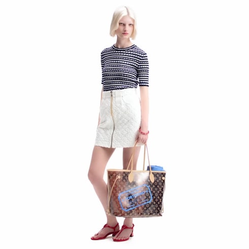 Rok mini ini tampil modern dalam sentuhan musim panas, melalui model A-line yang rapi dan ritsleting di bagian depan yang disertai penarik berbahan kulit dengan aksen fringe. Desainnya yang berbahan Monogram denim menghadirkan finishing fil coupé bernuansa senada khas musim ini. Sementara lapisan insert bernuansa polos yang kontras terlihat di bagian saku dan belakang. Rok ini disempurnakan hardware keemasan yang chic.