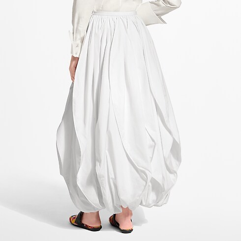 Personificando a exuberância da coleção desfilada, esta saia marcante envolve a silhueta em uma modelagem balonê volumosa, com barra assimétrica e dramática que toca o meio da coxa na parte frontal e se estende até o tornozelo na parte de trás. Confeccionada em popeline de algodão leve e arejado, é discretamente fechada na lateral com botão e zíper.