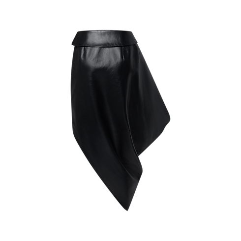 Inspirada pela inovação arquitetônica, esta saia da passarela apresenta um design elegante e escultural em couro de cordeiro granulado, drapeado com uma modelagem estruturada e assimétrica que vai até o tornozelo. A cintura com efeito dobrado e o zíper lateral invisível conferem um acabamento impecável, enquanto o forro em mescla de seda valoriza o conforto.