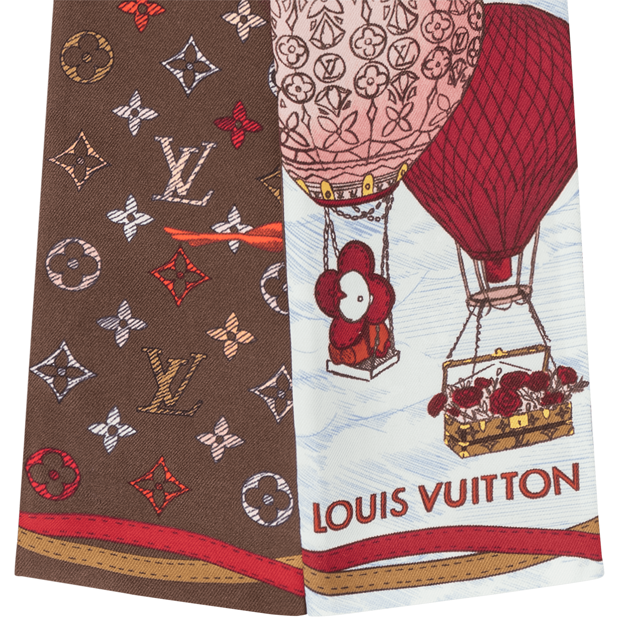 Este novo bandeau da coleção Spring-Summer 2023 apresenta o tema Up And Away em um tom de vermelho radiante. Remetendo à tradição da arte de viajar da Maison, um conjunto de balões flutua na seda, cada um carregando um baú ou bolsa LV. O icônico padrão Monogram no verso finaliza esta criação exclusiva.