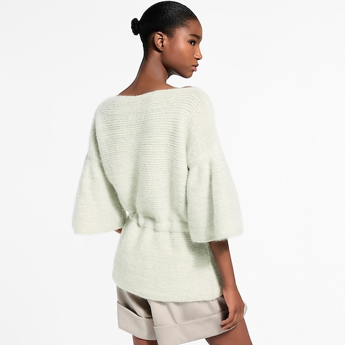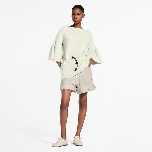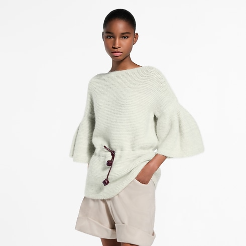 Nodding to the runway collection’s architectural influence, this knit top is crafted with an elegant bateau neckline and statement elbow-length bell sleeves that define a sculptural silhouette, while a leather cord belt trimmed with LV Cubes cinches the waist. It is spun from a lightweight blend of silk, alpaca and mohair for elevated warmth and comfort.