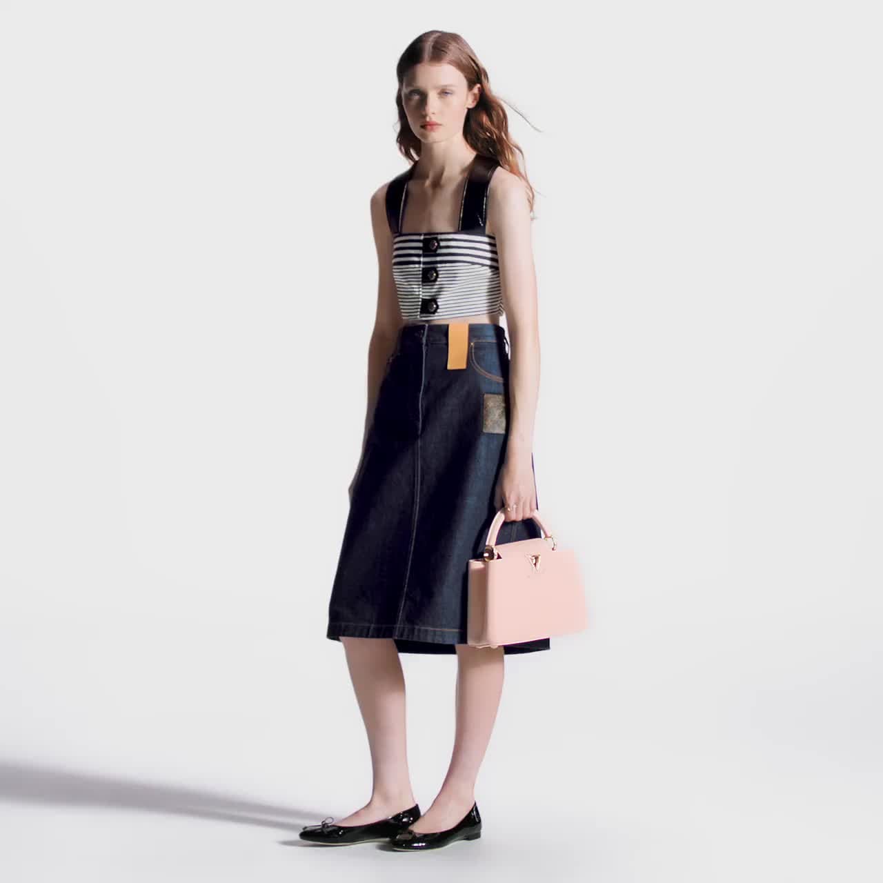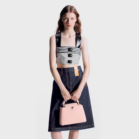 Confeccionada em couro Taurillon granulado, esta versão da bolsa Capucines BB vem em uma tonalidade superfeminina, inspirada nas flores do jasmim-rosa. A alça superior em couro e a alça larga removível permitem carregá-la no ombro e na transversal. A versátil Capucines pode ser usada com a aba por dentro ou por fora.