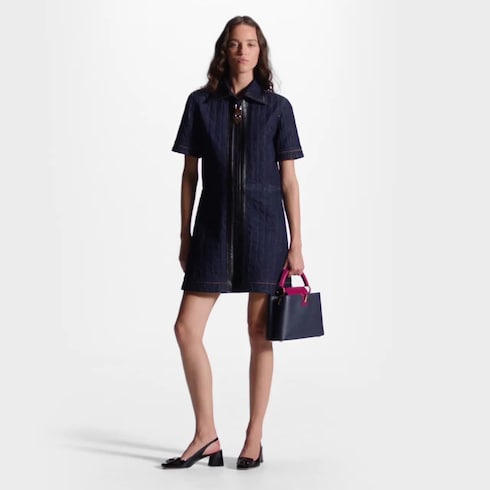 Ousada, esta bolsa Capucines BB é confeccionada em couro Taurillon azul-escuro, com detalhes em couro de avestruz vermelho na aba e na alça superior. O modelo pode ser usado com a aba dobrada para dentro, mostrando a assinatura LV, ou para fora, formando uma discreta Flor do Monogram. A alça larga e removível permite carregar a bolsa no ombro ou na transversal.
