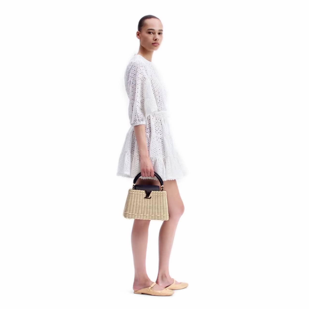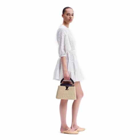 Esta bolsa Capucines BB é confeccionada artesanalmente em rattan, e cada peça leva dois dias para ser finalizada. Inspirada na estética praiana, ela evoca o icônico baú Picnic da Maison, de 1892 e por dentro revela um forro estampado. Esta bolsa pode ser usada com a aba dobrada por dentro ou por fora, e tem o tamanho perfeito para itens básicos do dia a dia.