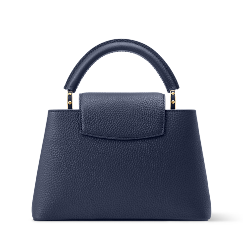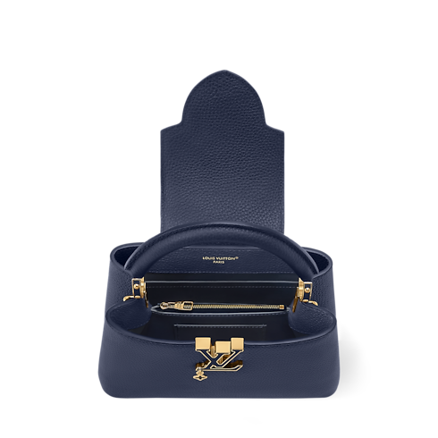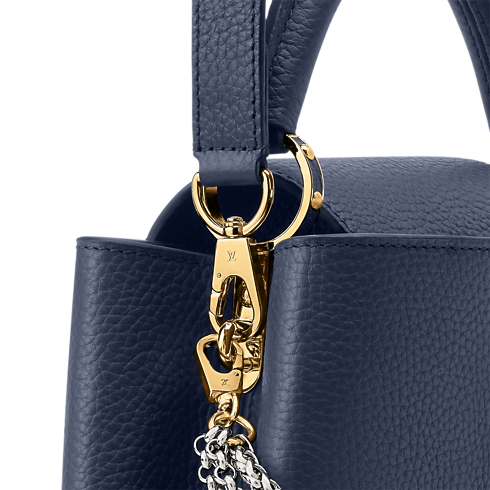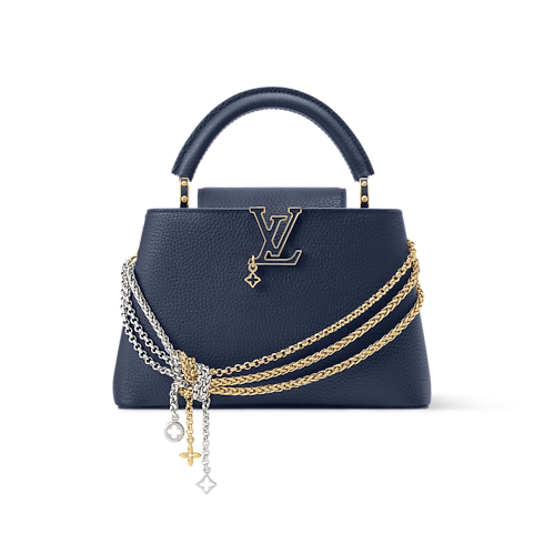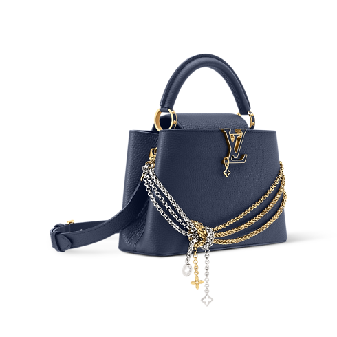 Parte da coleção Why Knot, esta Capucines BB é atualizada no atemporal azul navy, que contrasta com as ferragens em diferentes acabamentos. Confeccionada em couro Taurillon, destaca-se pela corrente decorativa e pelas LV Initials tom sobre tom, que homenageiam o savoir-faire da Maison. O modelo de duplo uso oferece espaço suficiente para carregar dois smartphones, ideal para quem se desloca pela cidade.
