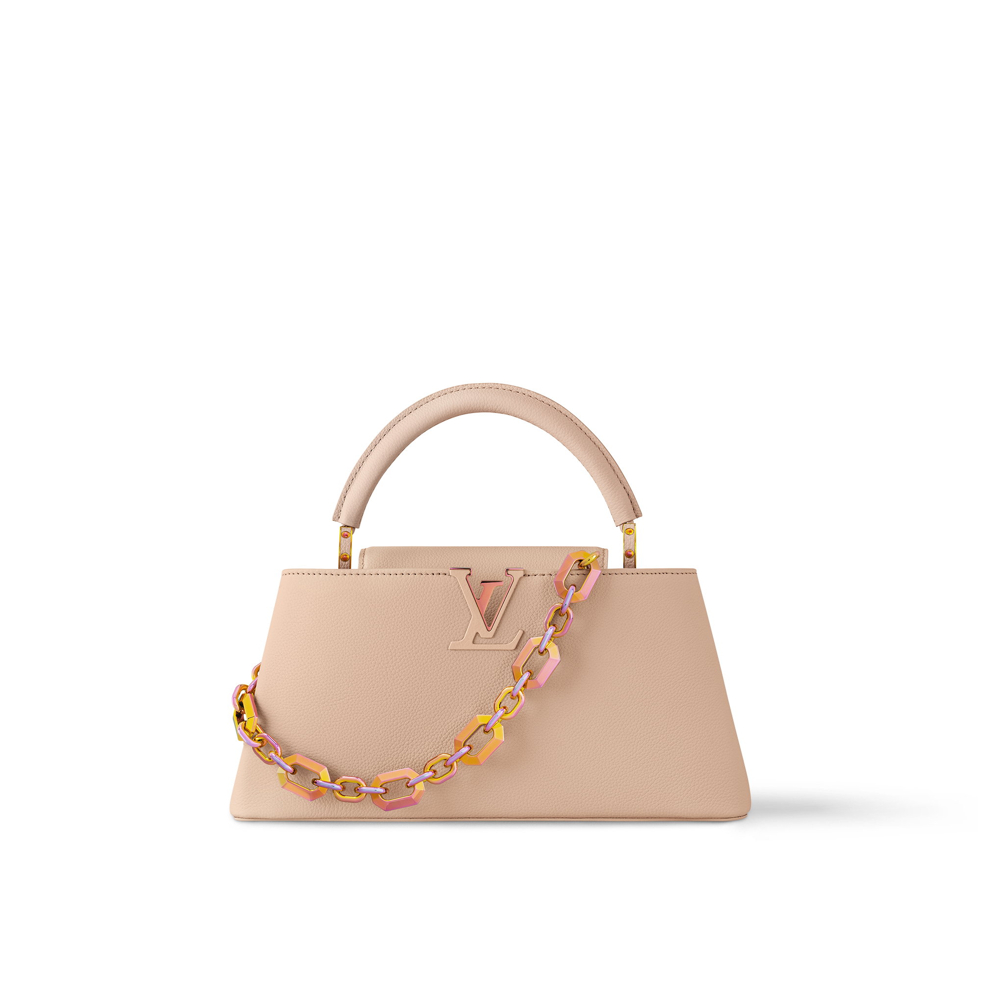Com design alongado, a bolsa Capucines East-West Mini é confeccionada em couro de vitelo granulado. As ferragens trazem o acabamento furta-cor Scarabeo da Maison, presente tanto nas LV Initials quanto nos elos octogonais da corrente removível Arty. Esta bolsa pode ser usada com a aba dobrada por fora ou por dentro, revelando as LV Initials.