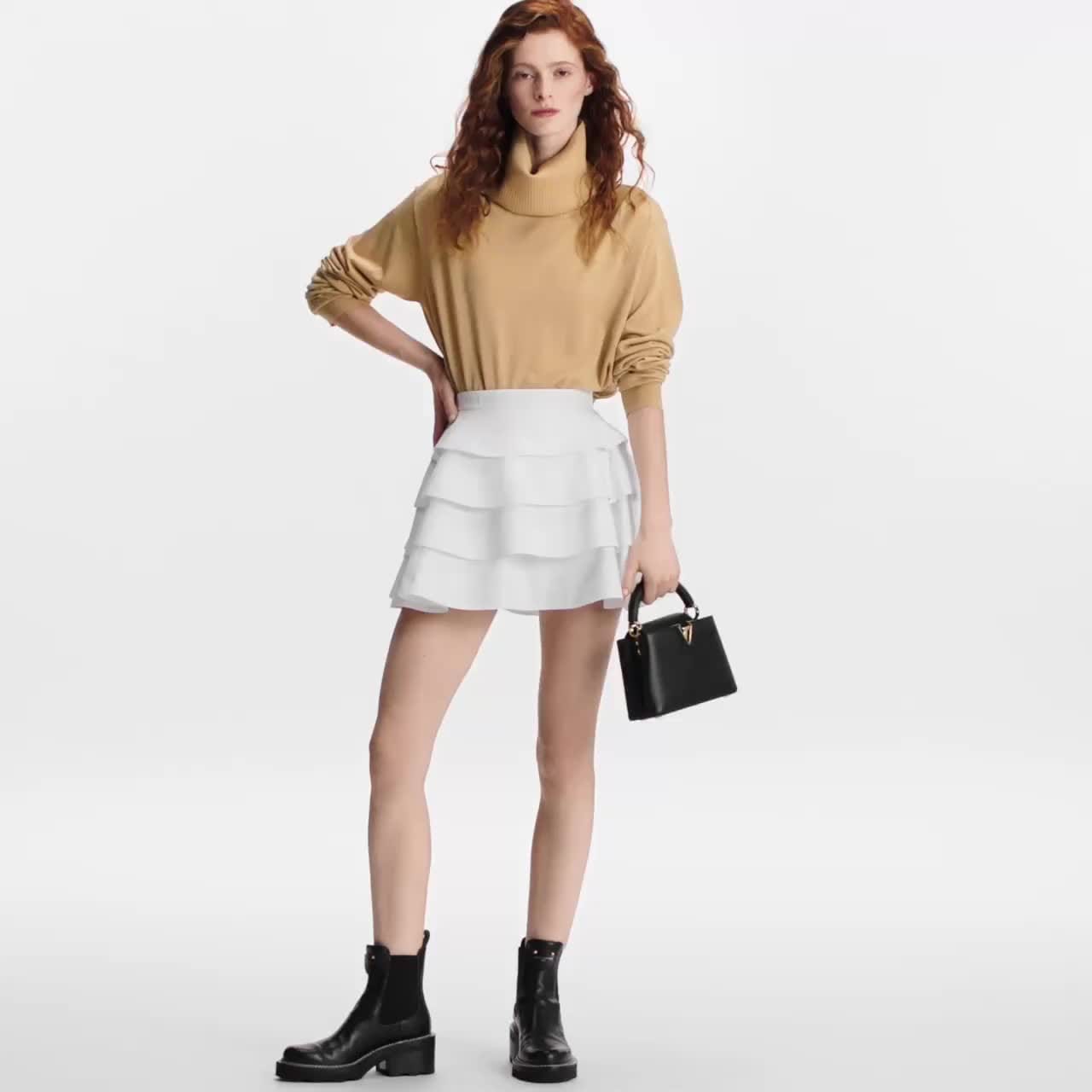 A sofisticada bolsa Capucines Mini aparece em uma versão superchic, em couro Taurillon preto. Para finalizar, alças com argolas douradas e as emblemáticas LV Initials. Essa versão compacta da clássica Capucines é confortável de usar sobre o ombro ou na transversal, graças à sua alça larga removível.