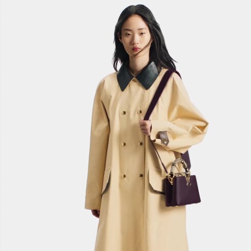 Produzida com o couro Taurillon granulado em um tom de roxo profundo, esta versão da bolsa Capucines Mini possui aba, alça superior e LV Initials em couro píton. A parte interna conta com forro de couro bege e bolso plano, enquanto a alça larga e removível, também em couro Taurillon, oferece várias possibilidades de uso.