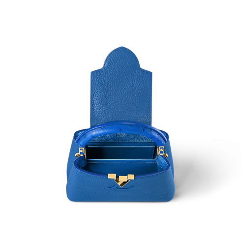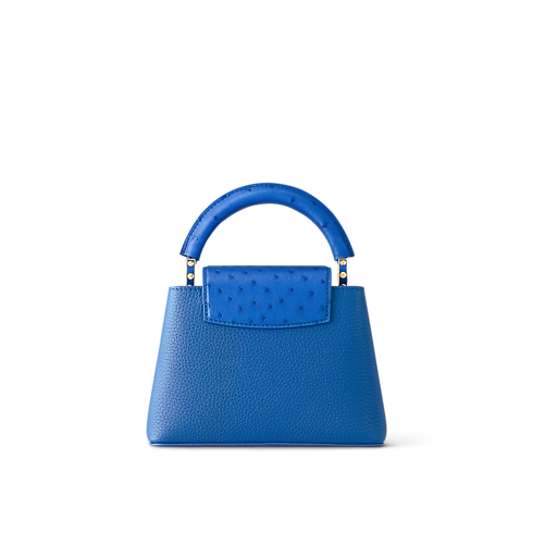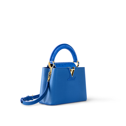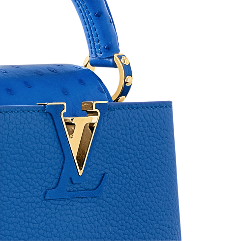 Esta edição feminina e alegre da bolsa Capucines Mini é confeccionada de forma artesanal em couro Taurillon granulado no marcante azul-safira. Ela é valorizada por uma alça e pela aba no exótico couro de avestruz. A icônica assinatura LV ganha acabamento em couro para iluminar qualquer look para a noite.