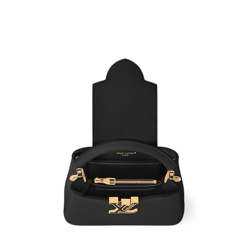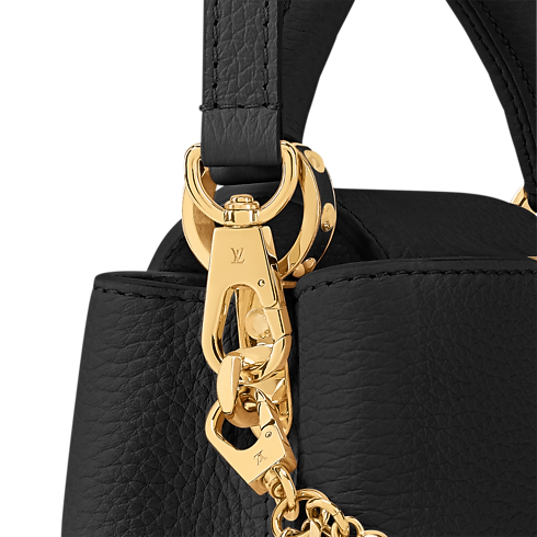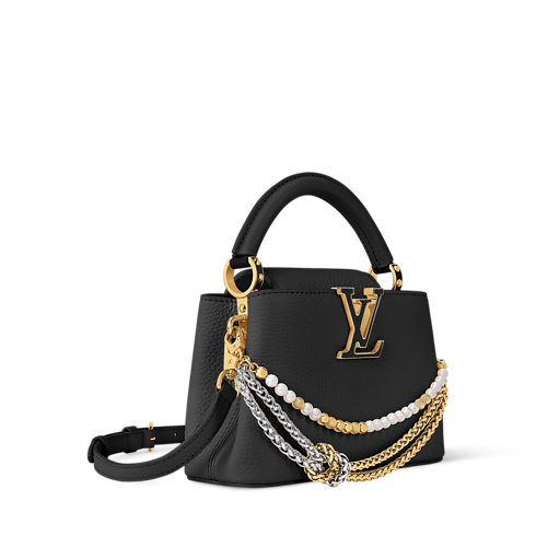 Parte da coleção Why Knot, esta versão da bolsa Capucines Mini é a escolha perfeita para soirées sofisticadas. Confeccionada no refinado couro Taurillon em um tom atemporal de preto, a peça é valorizada por uma corrente bigalvanizada inspirada em joias, trazendo icônicos charms Monogram e delicados detalhes de pérola. Com duas opções de estilo, o modelo pode ser usado com a aba por dentro ou por fora, oferecendo versatilidade.