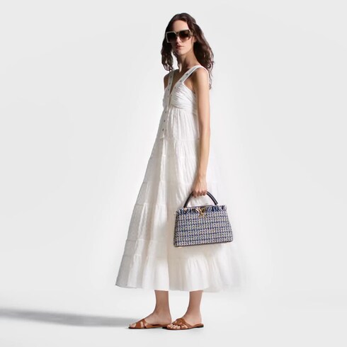 Produzida com um tweed brilhante e aconchegante, a bolsa Capucines MM desta temporada vem com seu icônico design repaginado na vibe do verão. O tecido é revestido pelo mix de ráfia azul navy e branca, cordões de algodão, fios prateados e acabamento com franja. A aba e as alças de mão e ombro são feitas de couro Taurillon granulado azul.