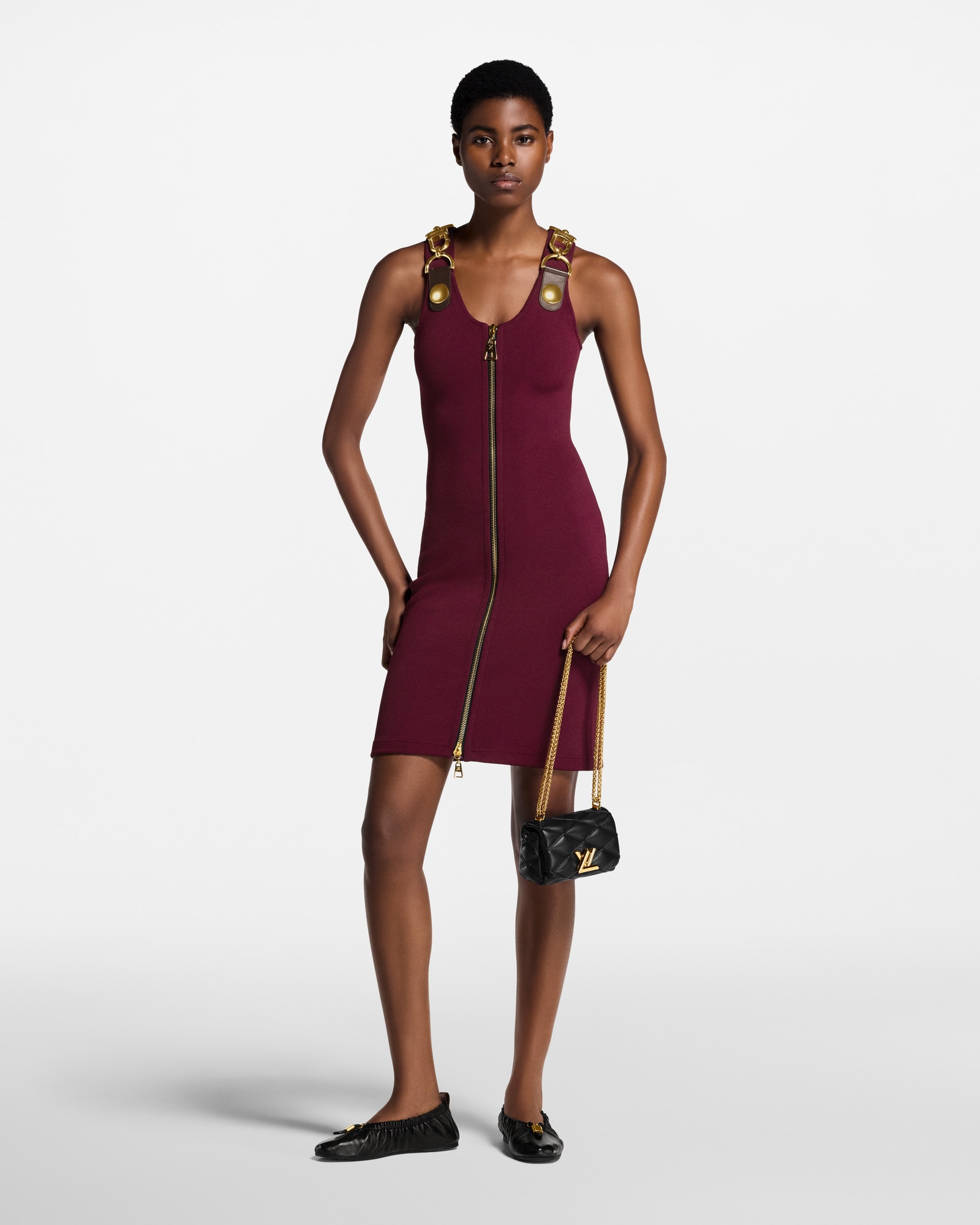 Este vestido elegante tem modelagem justa e sofisticada, confeccionada em jersey de crepe de viscose leve, em um tom intenso da temporada. A parte frontal se destaca com um zíper bidirecional, que vai do decote arredondado até a barra, enquanto mosquetões dourados e robustos dão um toque rebelde aos ombros.