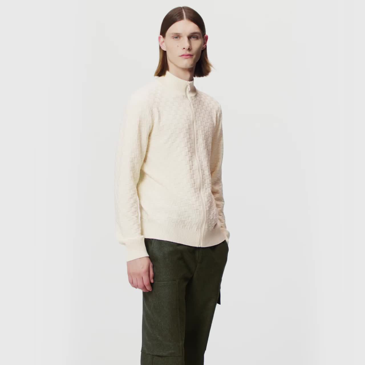 Este cardigã atemporal com zíper é confeccionado em lã proveniente de fontes responsáveis, em um sutil jacquard Damier no mesmo tom, criando um acabamento texturizado. Esta peça versátil pode ser usada em sobreposições formais e também em looks do dia a dia.