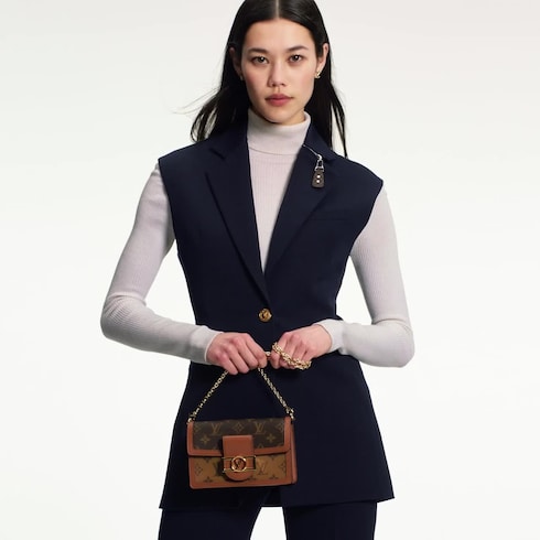 Combinando canvas Monogram e Monogram Reverse, a bolsa-carteira Dauphine revisita todos os símbolos da icônica coleção Dauphine: o visual vintage, o acabamento em couro de vitelo e o fecho LV Circle. Esta carteira elegante e espaçosa vem com uma corrente removível dourada, permitindo diversas formas de uso.