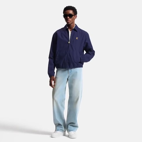 The timeless silhouette of this dark blue coach jacket is crafted from a blend of cotton, wool and silk. A VVN leather-inspired LV patch adorns the chest in homage to the House’s leather goods heritage. Mini Monogram-embossed suede leather accents the underside of the collar, while a Monogram motif embellishes the lining. Matching shorts make a smart set.