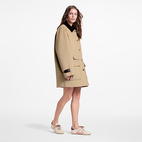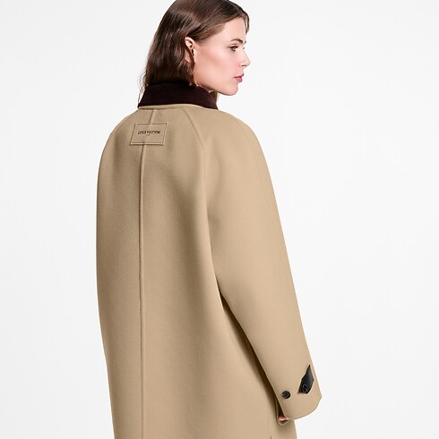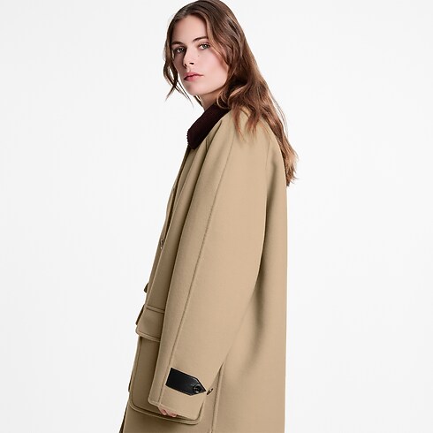 Este casaco atemporal apresenta uma modelagem reta, confeccionada em uma aconchegante mescla dupla face de lã, algodão e seda. Três bolsos com aba ressaltam a estrutura da peça, enquanto a gola em veludo cotelê contrastante e os botões em marfim conferem um toque masculino. Os punhos podem ser ajustados com abas de couro, e uma tag de echarpe Louis Vuitton acrescenta uma assinatura contemporânea à parte de trás.