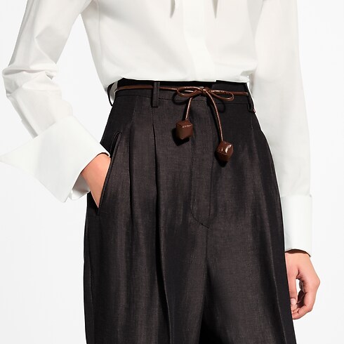 These pants take a laidback approach to tailoring in a breezy wool-linen blend in a rich seasonal shade. They are crafted in an elegant wide-leg shape with crisp creases adding a touch of structure to the legs. The high-rise waistband is finished with this season’s slim leather cord belt and signed with a Louis Vuitton Paris patch.