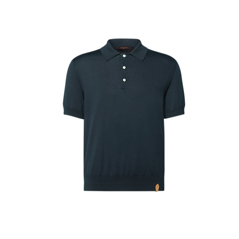 Esta camisa polo de manga curta em azul navy traz uma sofisticação discreta ao visual com seu tricô fino e brilhante em algodão e seda. Detalhes sutis incluem costura LV no botão superior e uma aba de couro VVN na barra esquerda. Esta peça versátil combina perfeitamente com composições casuais ou formais.