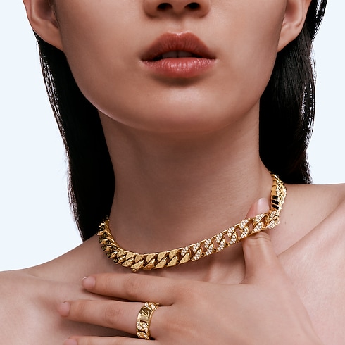 Parte da coleção Cuban Chain, este anel exclusivo em ouro 18 quilates é cravejado à mão com diamantes brancos. A joia traz LV Initials gravadas no centro, cercadas pela padronagem de elos que se destaca na coleção. Com seu estilo genderless, esta peça preciosa se adapta a qualquer look e a todos os gostos.