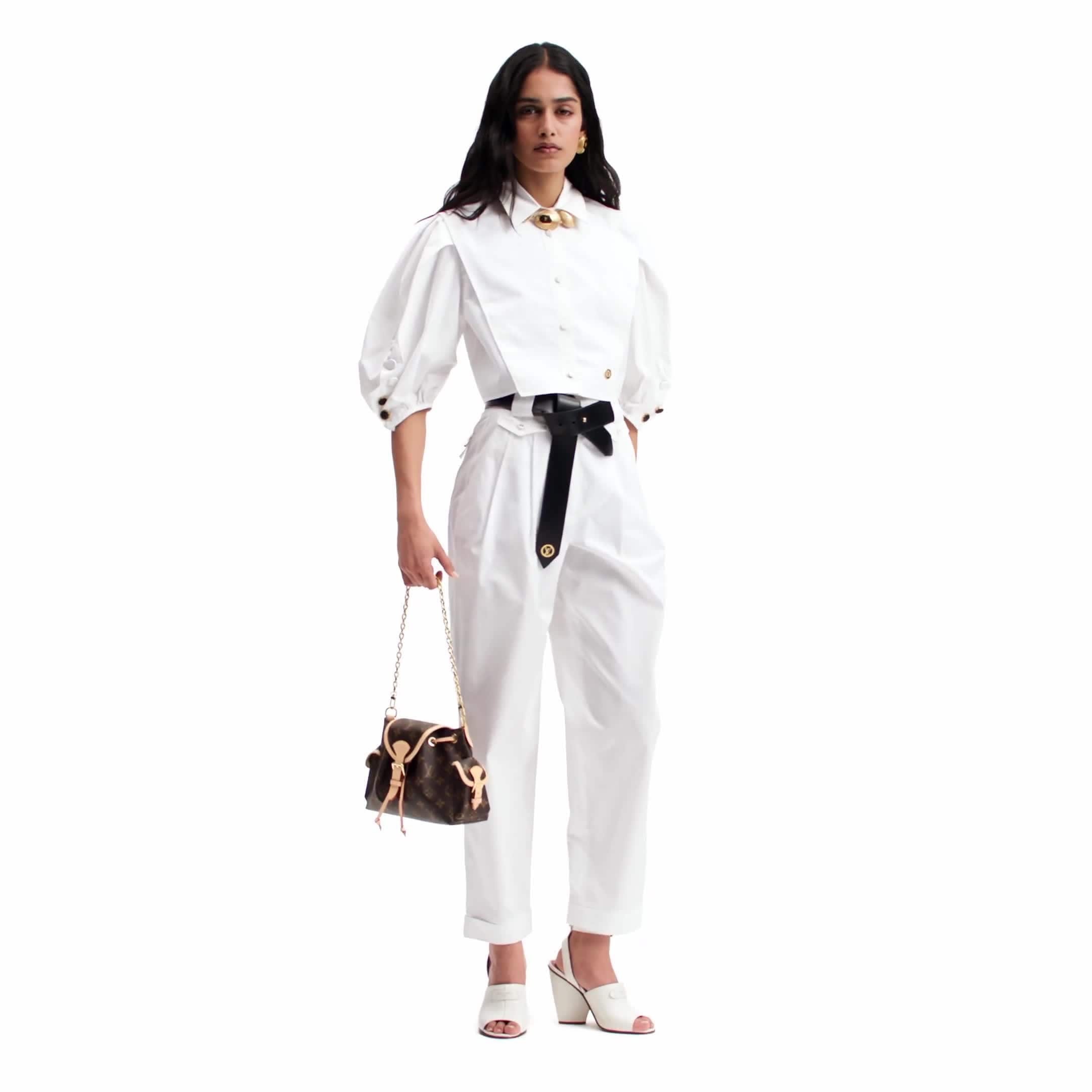 Esta calça em popeline de algodão encorpado, com corte cenoura amplo acentuado por plissados nos quadris, traz um frescor de verão. A cintura alta e larga valoriza a silhueta, enquanto dois minibolsos com aba conferem um toque estruturado. O botão bordado da estação, com um elegante acabamento dourado, valoriza o fecho com um toque sofisticado.
