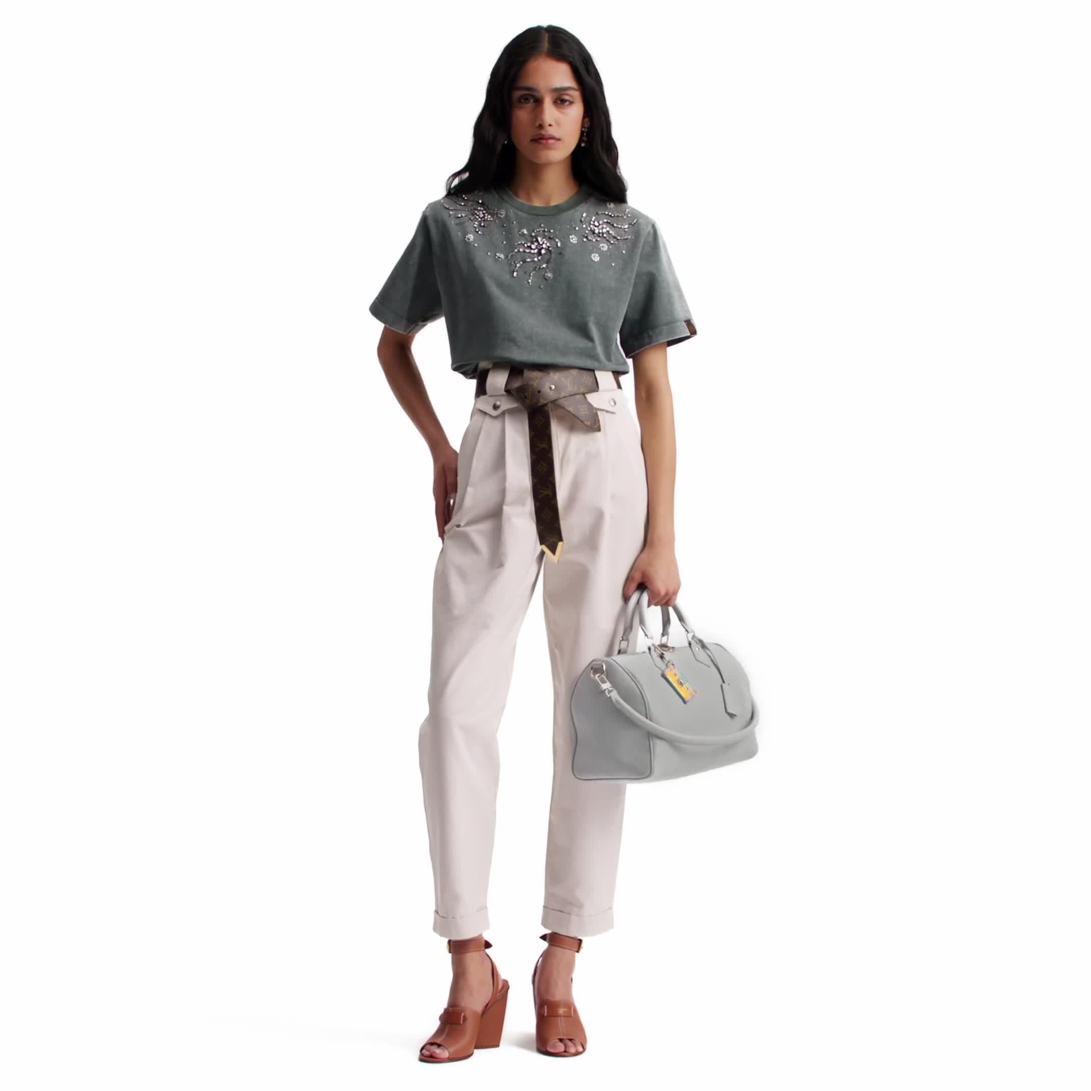 Esta calça é confeccionada em algodão macio com textura aveludada e corte cenoura amplo, finalizado com bainhas dobradas e cintura alta e larga que valoriza a silhueta. Os quadris apresentam minibolsos com aba e plissados que realçam o modelo fluido, enquanto os sofisticados botões metálicos desta estação conferem um toque final refinado.