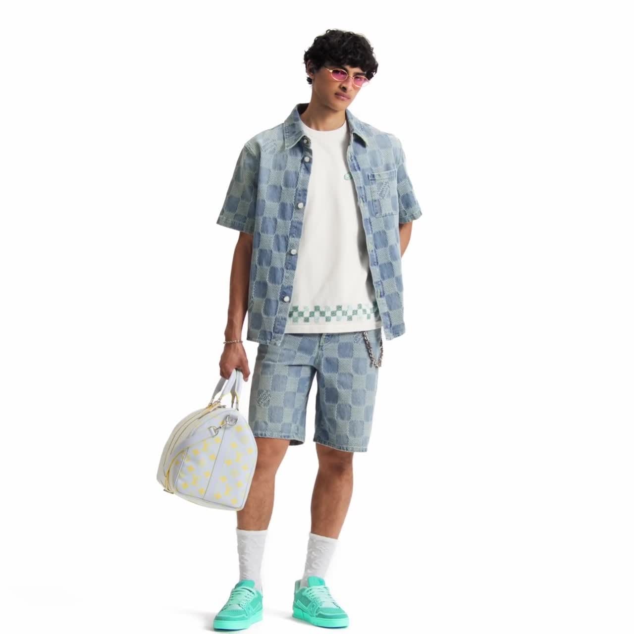 Um item essencial para o verão, esta camisa jeans de manga curta é decorada com o icônico jacquard Damier 3D texturizado, incorporando assinaturas Marque L.Vuitton Déposée. Tons de azul-índigo estonado tornam esta peça fácil de combinar. Grandes botões com efeito perolado trazem um toque elegante. A camisa cria um conjunto contemporâneo se combinada com o short da mesma linha.