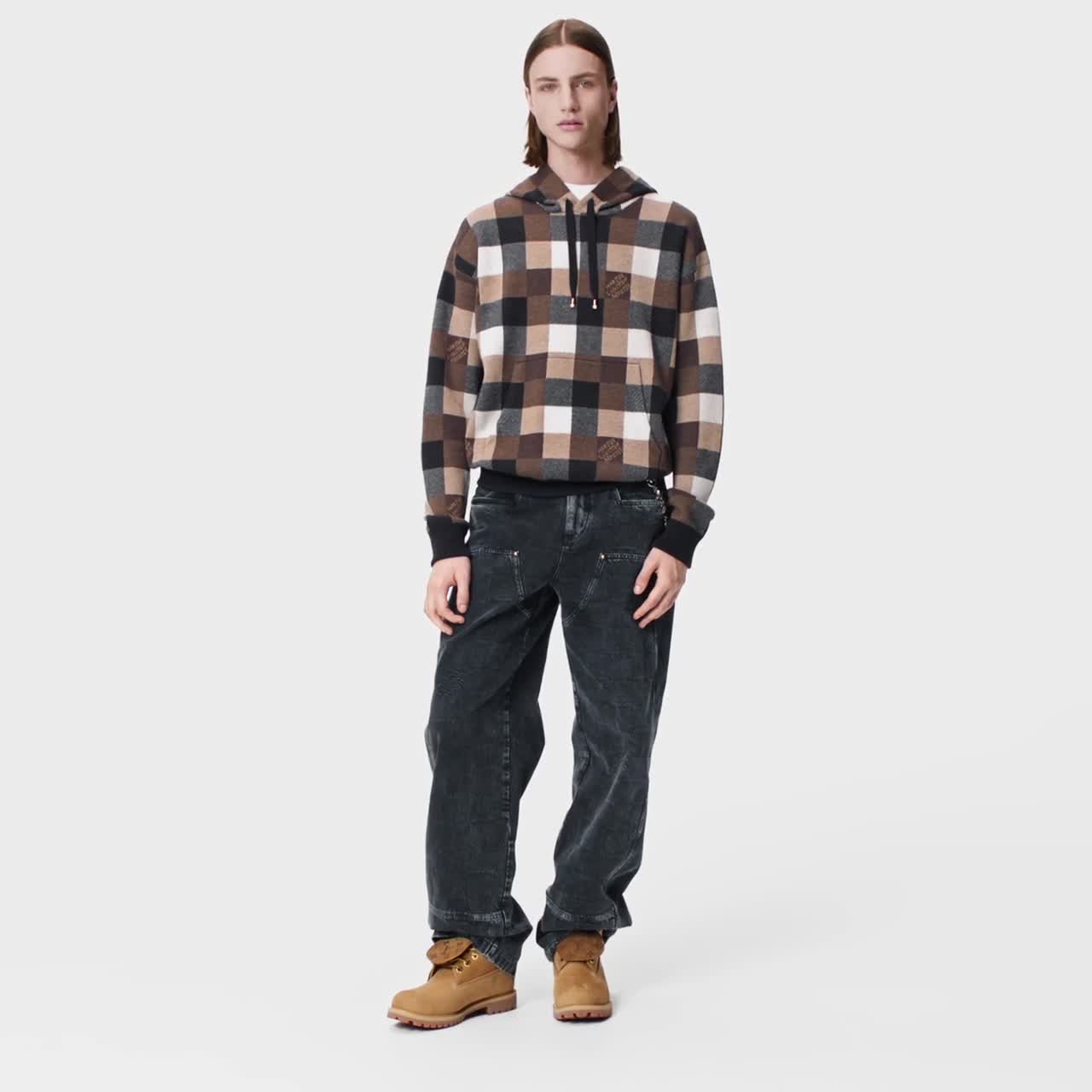 Em uma mescla refinada e macia de cashmere e lã, este sofisticado moletom com capuz revela o xadrez country do desfile Fall-Winter 2024. Assinaturas “Marque L.Vuitton déposée” são integradas ao jacquard, enquanto as pontas do cordão do capuz ajustável trazem pérolas e Flores do Monogram. Elegante e despojada, esta peça casual complementa as silhuetas utilitárias da coleção.