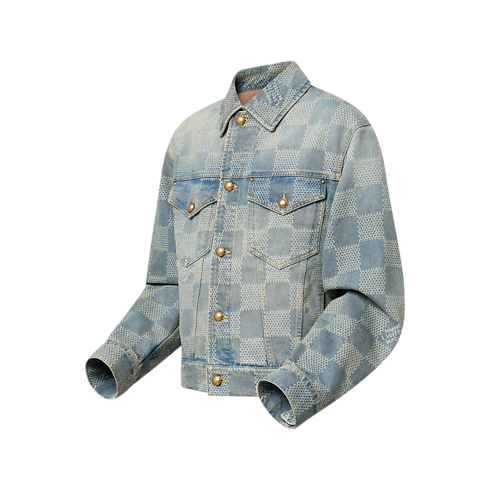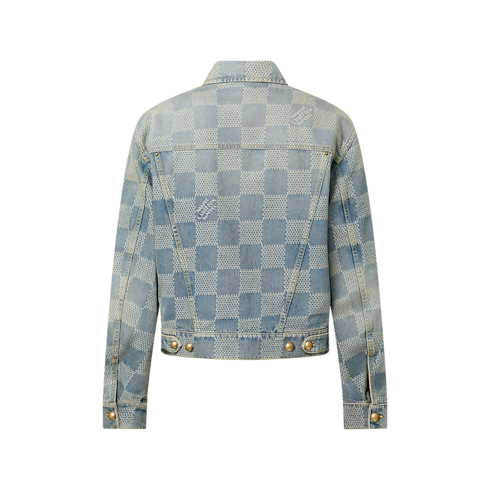 A clássica silhueta desta jaqueta jeans ganha destaque com o jacquard Damier 3D, que apresenta as assinaturas Marque L. Vuitton Déposée em um elegante efeito texturizado. Confeccionada em jeans azul-índigo estonado, a peça é complementada por pespontos amarelos, detalhes em tom de cobre envelhecido e botões bombê. Um item indispensável no guarda-roupa e que possui uma calça jeans correspondente.