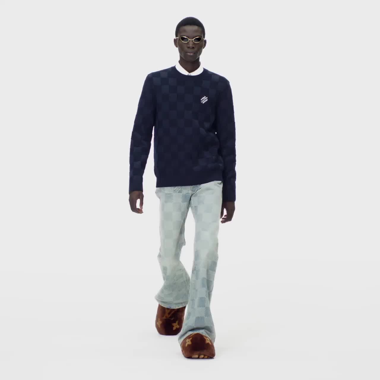 Este pulôver de lã Merino em azul-escuro revisita a tradicional padronagem Damier da Maison em uma malha texturizada tom sobre tom. O refinado bordado de pérolas enriquece a peça, apresentando a nova assinatura “Marque L. Vuitton déposée”, revelada durante o desfile Spring-Summer 24. Com sua elegância sutil, este pulôver atemporal complementa perfeitamente uma ampla variedade de looks.