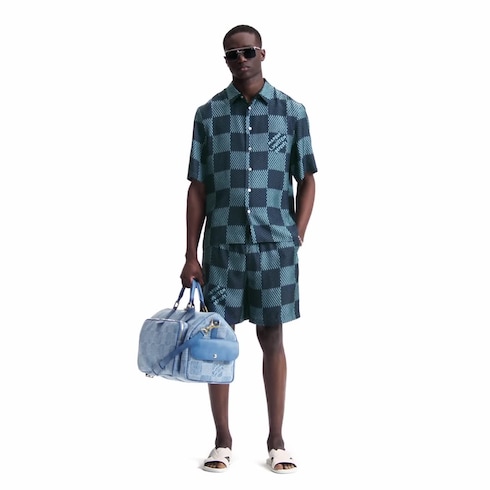 Confeccionada em seda, esta camisa de manga curta traz o padrão Damier com assinaturas Marque L. Vuitton Déposée. O tecido brilhante em elegantes tons de azul combina facilmente com peças lisas, compondo um visual casual e chic para o verão. Combina perfeitamente com o short do conjunto para criar um look perfeito para o dia todo.