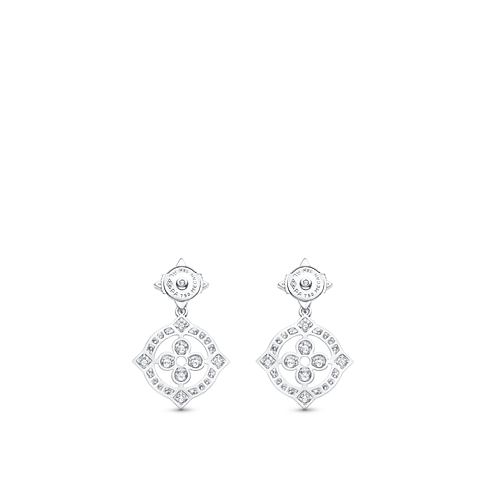 Estes brincos da Coleção Dentelle são moldados em ouro branco 18 quilates, cravejados à mão com diamantes preciosos. Os motivos de flores do Monograma, criados em 1896 por Georges-Louis Vuitton, combinam-se em um design vazado gracioso, semelhante à renda, que se traduzem em peças exclusivas com uma atitude moderna. Com cada movimento, as joias brilham ainda mais.