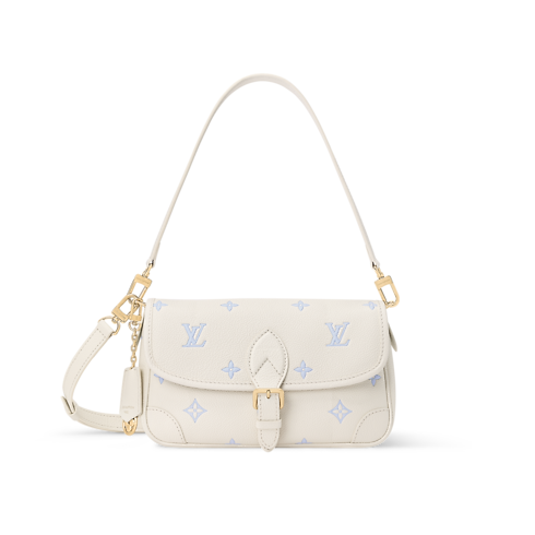 A bolsa Diane é reinventada em uma paleta chic, com tons elegantes de branco leitoso e azul. Esta edição contemporânea é confeccionada em couro Monogram Empreinte e decorada com ferragens em dourado claro. Valorizada com um charm LV removível, ela se abre para revelar um bolso com zíper plano, perfeito para guardar pequenos objetos.