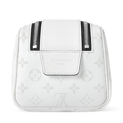 A nécessaire Dopp Kit é elaborada em canvas branco com uma padronagem Monogram sutil. O acabamento em couro no mesmo tom e as ferragens prateadas finalizam este modelo discreto. O fecho com zíper duplo e a abertura ampla facilitam o acesso aos itens de cuidados pessoais, enquanto o forro em tecido lavável garante praticidade excepcional.