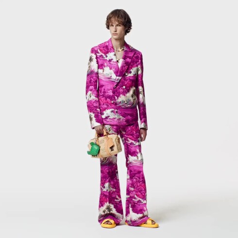 Este marcante blazer de alfaiataria trespassado em tonalidades vibrantes de rosa é inspirado na ilha tropical paradisíaca desta coleção. Confeccionado em mescla de algodão e linho jacquard Damier com assinaturas "Marque L.Vuitton Déposée", ele traz a padronagem LV Surf. Botões perolados dão um toque dândi à peça, que se torna um look impactante quando combinada com calça flare da coleção.