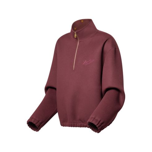 Este pulôver híbrido com meio-zíper é confeccionado na modelagem de um casaco estruturado e macio em uma sofisticada mescla de lã e cashmere dupla face. O tom vinho elegante no interior traz uma refinada padronagem em jacquard LV Blason em tons dourados. Esta peça moderna traz assinaturas sutis no peito e nas costas.