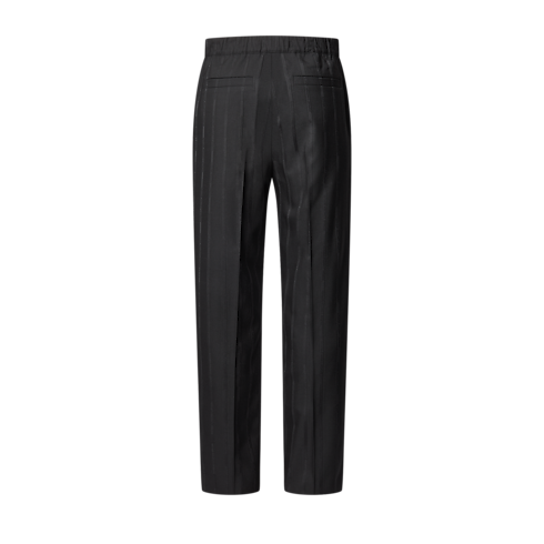 Elegante e contemporânea, esta calça preta com cordão revisita os modelos de alfaiataria com sua silhueta fluida e descontraída. Confeccionada em lã leve e certificada, apresenta um jacquard listrado em tom sobre tom na trama com assinaturas "Marque L.Vuitton Déposée". Combina perfeitamente com um blazer desconstruído para formar um conjunto de verão.