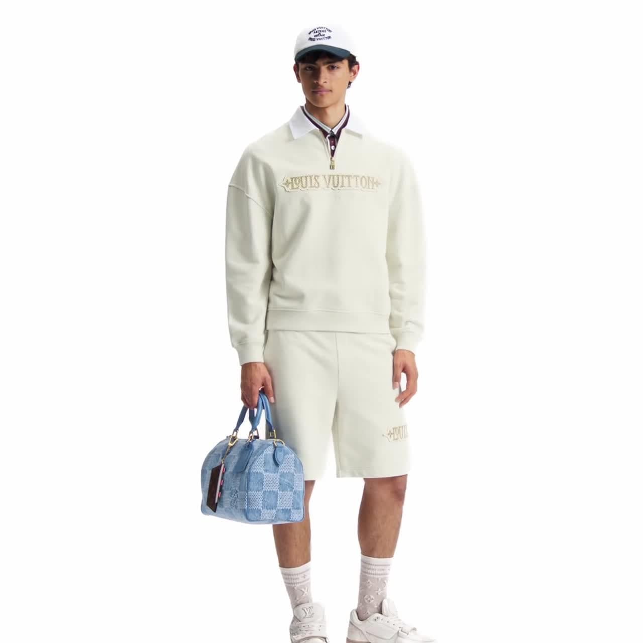 Perfeito para dias relaxantes a bordo do cruzeiro desta coleção, este moletom em algodão orgânico em tons elegantes possui colarinho branco de camisa e um meio-zíper contemporâneo na gola. Um patch Louis Vuitton texturizado decora o peito, enquanto uma discreta assinatura Louis Vuitton bordada valoriza a parte de trás do cós. Com o short da coleção compõe um conjunto descontraído.