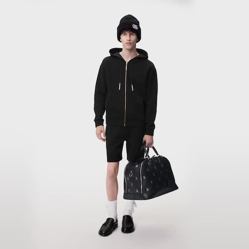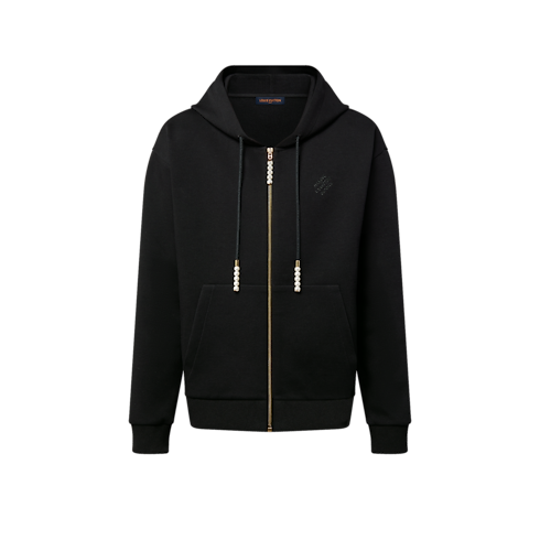 Este moletom com capuz e zíper é uma peça versátil para finalizar looks casuais. Decorado com pérolas nos reguladores dos cordões e no puxador do zíper, faz referência à inspiração dândi do desfile Spring-Summer 24. Traz uma assinatura “Marque L. Vuitton déposée” bordada no peito, e pode ser combinado com o short da mesma coleção.