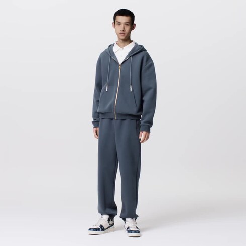 Esta jaqueta com capuz e zíper, com seus detalhes exclusivos, é uma peça versátil para completar looks casuais. As contas peroladas nos reguladores lembram a inspiração dândi desta coleção, enquanto um bordado "Marque L. Vuitton déposée" assina o peito. A calça jogger combinando completa esta jaqueta.