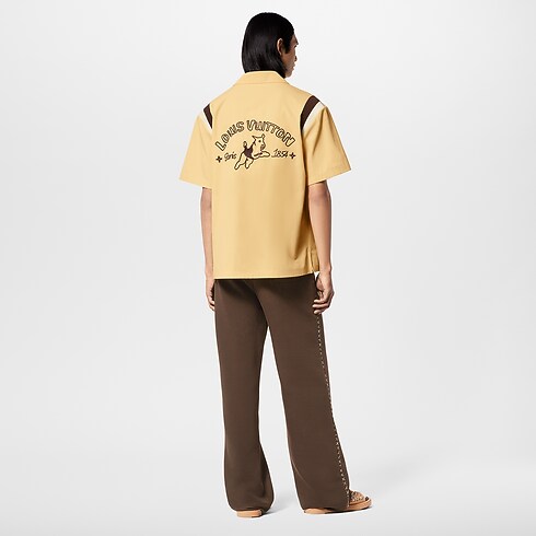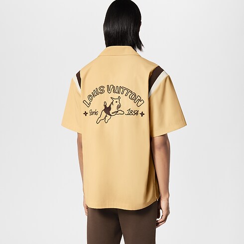 Esta camisa de boliche de inspiração vintage retrata a colaboração com Tyler, The Creator e sua estética alegre e singular. Os beges são realçados por detalhes contrastantes nos ombros, enquanto assinaturas da Maison bordadas no peito e nas costas apresentam o LV Jumping Dog, mascote da coleção. Esta peça combina perfeitamente com as calças chino e de alfaiataria da temporada.