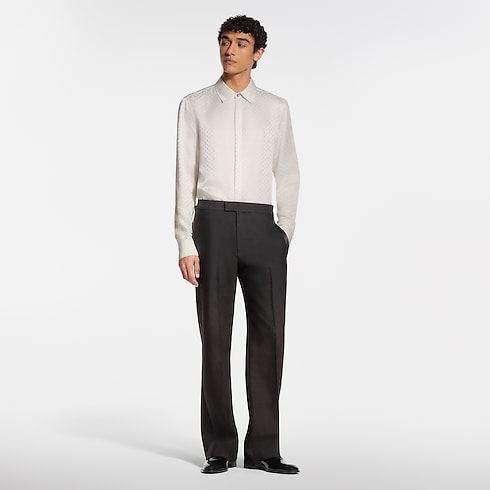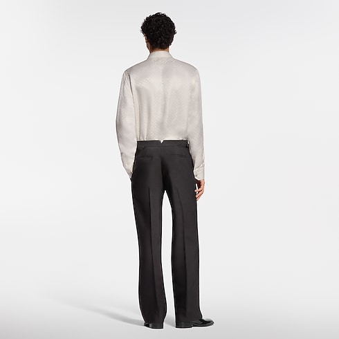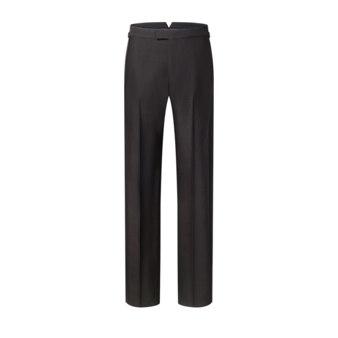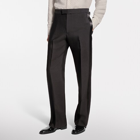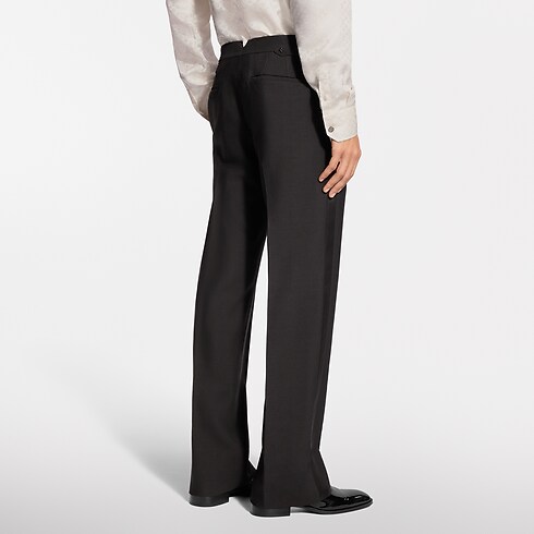 Esta calça preta de smoking é impecavelmente elegante, confeccionada em crepe de lã com seda drapeada e faixas acetinadas por fora de cada perna. O cós ajustável garante uma silhueta elegante, enquanto rebites de Flor do Monogram acrescentam assinaturas discretas às abas. Um paletó de smoking e uma camisa da coleção completam um conjunto chic para a noite.
