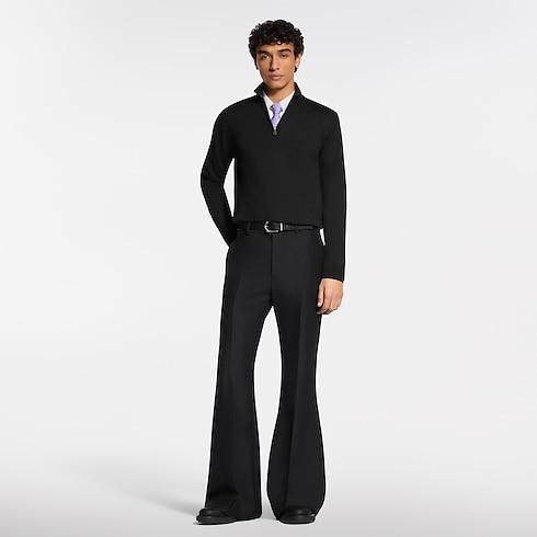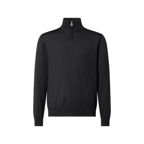 Este elegante suéter preto com meio zíper é confeccionado em uma sofisticada mescla de lã, seda e cashmere, proporcionando um toque suave para máximo conforto. O tricô leve e refinado apresenta bordado exclusivo na barra esquerda e um patch de couro LV nas costas. Esta peça atemporal pode ser usada aberta sobre uma camisa ou fechada com zíper, como uma gola rolê.