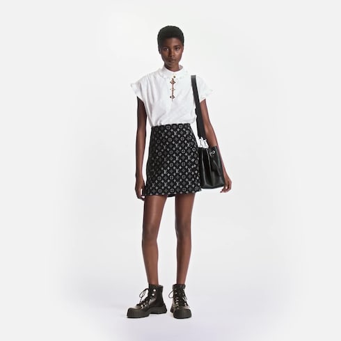 Feita a partir de popeline de algodão macio embelezada com Monogram fil coupé, esta Blusa Frill apresenta detalhes ricos, com botões dourados LV na gola e enfeites dourados do padrão Monogram Flower ao longo da frente. Com detalhes femininos na gola e nas mangas, esta icônica peça da Louis Vuitton é um guarda-roupa indispensável.