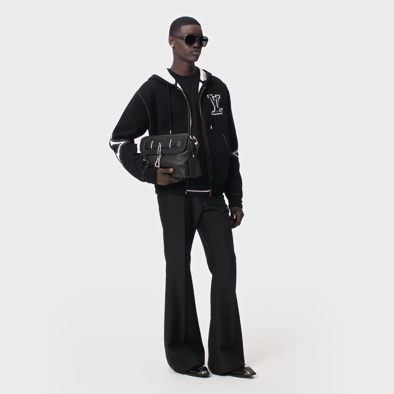 Este moletom preto de algodão com capuz e zíper apresenta uma sofisticada malha em intársia com linhas pontilhadas, criando uma ilusão de pespontos e bordados. O peito traz um LV contrastante, enquanto uma Flor do Monogram grande confere uma assinatura a cada cotovelo. Casual e elegante, a peça pode ser usada em looks com sobreposição.