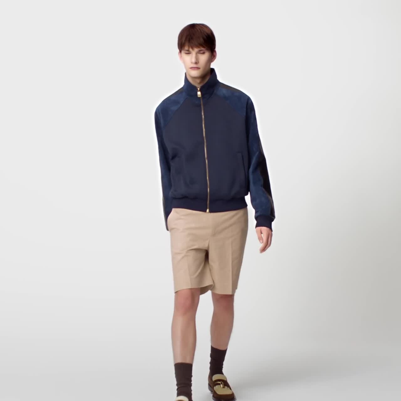 Esta elegante jaqueta azul navy tem silhueta esportiva e detalhes elegantes. O corpo em jersey de mescla de algodão é valorizado com mangas em suede macio e faixas de couro preto com LV em alto-relevo ,inspiradas nos baús da Maison. Outras assinaturas incluem um discreto Louis Vuitton bordado no peito e uma etiqueta de couro 'Marque L.Vuitton déposée' atrás. Contemporânea e atemporal, esta peça híbrida confere um toque sofisticado a looks casuais.