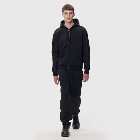 Este moletom híbrido com capuz e zíper é perfeito para fins de semana casuais, sobretudo se usado com a calça do conjunto. O corpo vem em jersey texturizado no padrão LV Epi XL desta coleção, em malha com alto-relevo. Com o icônico LV bordado no peito, o modelo traz capuz e mangas tecnológicas acolchoadas que reforçam seu visual esportivo.