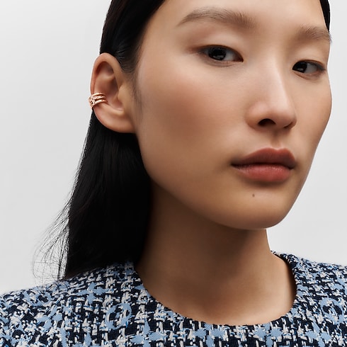 Elaborado em ouro rosa 18 quilates, o brinco ear cuff unitário Idylle Blossom homenageia a Monogram Flower. Uma flor repousa sobre três aros de ouro rosa, enquanto oito brilhantes equilibram-se sobre suas quatro pétalas. Usada sozinha ou combinada com outros brincos, essa peça é ideal para compor diversos looks.