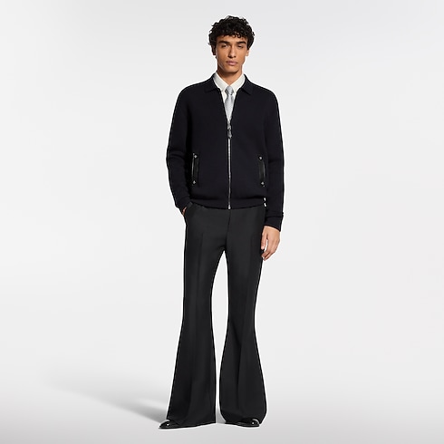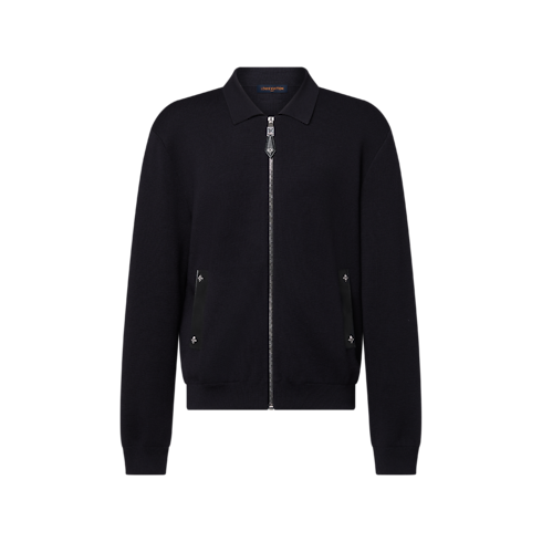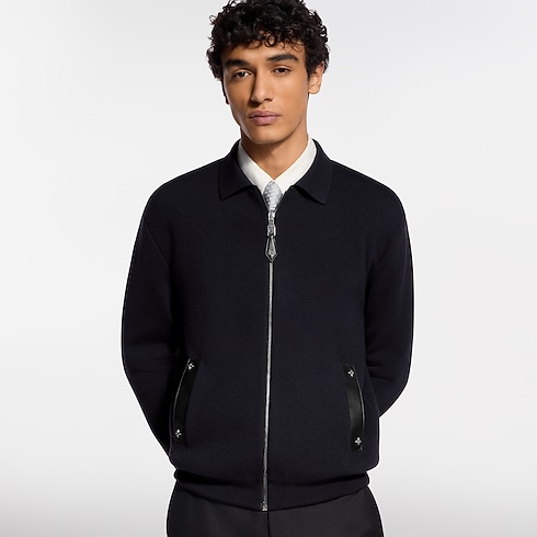 Esta jaqueta de malha azul-escura é uma peça tanto contemporânea quanto atemporal. É realçada por detalhes em couro tom sobre tom, incluindo bolsos debruados e um puxador de zíper adornado com rebites de Flor do Monogram. Pode ser usada de diversas formas: como uma camada externa elegante ou sob um casaco, combinada com uma camisa para um visual sofisticado ou com uma camiseta para um estilo mais casual.